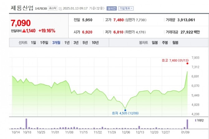 13일 한국거래소에 따르면 오전 9시17분 현재 제룡산업은 전 거래일 대비 19.16% 오른 7090원에 거래중이다.
