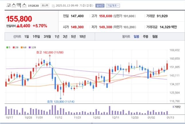 이날 급등은 코스맥스의 4분기 실적이 예상보다 좋을 것이라는 증권가 전망에 따른 것으로 보인다.