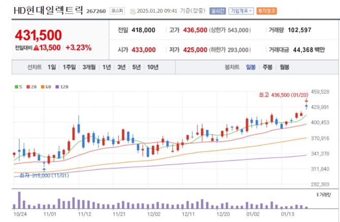 이미지 확대보기20일 한국거래소에 따르면 이날 오전 9시41분 현재 HD현대일렉트릭은 전장 대비 3.23% 오른 43만1500원에 거래되고 있다. 장중 43만6500원까지 오르며 52주 신고가를 기록했다.