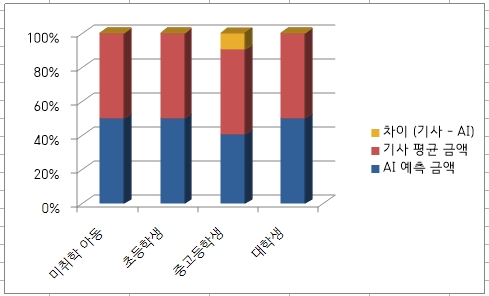 결과적으로 보면 인공지능이 분석한 세뱃돈 예상 금액과 기사에서 언급된 평균 금액을 비교해보니, 대부분의 연령대에서는 큰 차이가 없었다. 하지만 중고등학생의 경우, AI 예측 금액(6만 원)과 기사 평균 금액(7만 4천 원) 사이에 1만 4천 원의 차이가 있었다. 이를 제외하면 미취학 아동, 초등학생, 대학생의 세뱃돈 금액은 AI 분석 결과와 기사 데이터가 동일하게 나타났는데, AI의 분석이 좀 더 4~50대 부모의 생각에 더 부합했다.