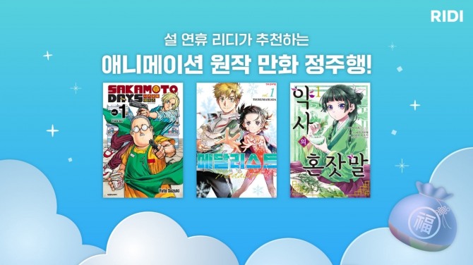 리디는 설 연휴 동안 만화와 웹툰을 마음껏 즐길 수 있는 할인 이벤트를 실시한다. 리디의 인기 만화와 웹툰 세트를 할인된 가격에 소장할 수 있으며, 구매 고객에게는 포인트를 증정한다.