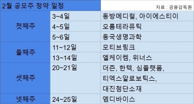 2일 금융감독원 전자공시시스템에 따르면 2월에 일반 투자자 대상으로 공모 청약을 받는 기업은 총 13곳이다. 지난달 8곳과 비교해도 증가세가 두드러진다.