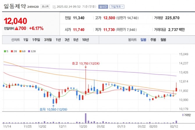 14일 한국거래소에 따르면 오전 9시 52분 기준 일동제약은 전장 대비 6.17% 오른 1만2040원에 거래되고 있다. 주가는 한때 10.23% 오르기도 했다.