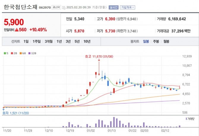 이미지 확대보기20일 한국거래소에 따르면 오전 9시 39분 현재 한국첨단소재는 전 거래일 대비 10.49% 급등하고 있다. 관련 주인 아이윈플러스 8.26%, 케이씨에스 6.09%, 엑스게이 4.87% 등 양자컴 관련주가 상승하고 있다.