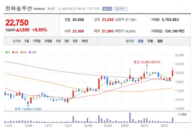 이미지 확대보기27일 한국거래소에 따르면 한화솔루션은 오전 9시 55분 현재 전 거래일 대비 8.85% 오른 2만 2750원을 기록하고 있다. 같은 기간 한화솔루션우 20.57%, HD현대에너지솔루션 11.17%, OCI홀딩스 7.79% 등도 상승세다.