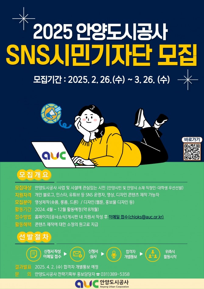 이미지 확대보기모집인원은 8명 내외이며, 안양시민과 관내 직장인·대학생을 우선 선발한다. 접수 후 심사를 거쳐 4월부터 12월까지 약 8개월간 활동할 예정이다.