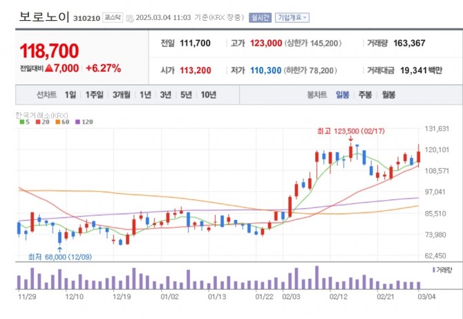 이미지 확대보기4일 한국거래소에 따르면 오전 11시 03분 현재 보로노이는 전 거래일보다 6.27% 오른 11만 8700원에 거래되고 있다.