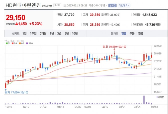 이미지 확대보기13일 한국거래소에 따르면 오전 9시 22분 기준 HD현대마린엔진은 전일보다 5.23% 오른 2만9150원에 거래되고 있다.