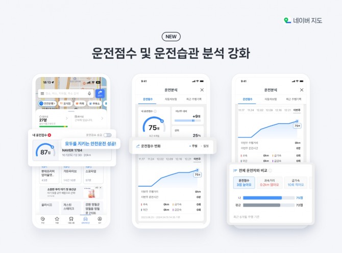 운전자가 자신의 운전 습관을 점검할 수 있는 '운전분석' 페이지도 강화됐다. 이번 업데이트를 통해 사용자는 자신의 운전 점수 변화를 주별, 월별 그래프로 확인할 수 있으며, 네이버지도 내비게이션으로 최근 4주간 10km 이상 주행 시 자신의 운전 점수와 운전 습관을 다른 운전자들의 평균과 비교해 볼 수 있다.