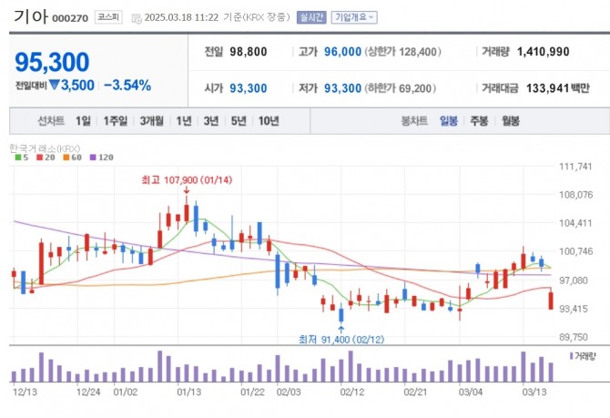 이미지 확대보기18일 한국거래소에 따르면 기아는 이날 오전 11시 22분 현재 전 거래일 대비 3.54% 내린 9만 5300원에 거래되고 있다.
