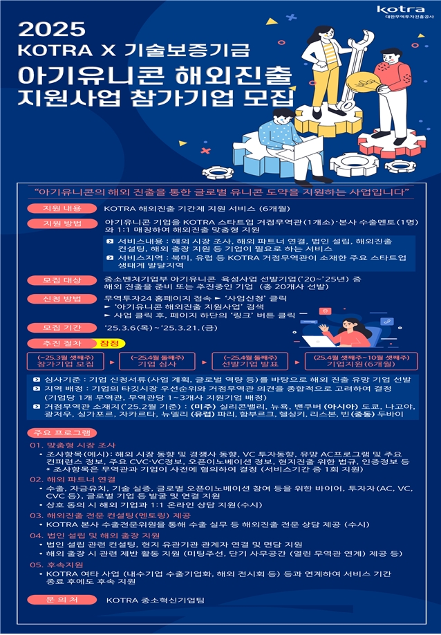 ‘아기유니콘 해외진출 지원사업’은 중소벤처기업부와 기술보증기금이 선발한 아기유니콘 기업이 해외 시장에 진출할 수 있도록 KOTRA가 16개 스타트업 거점무역관을 통해 맞춤형 지원을 제공하는 사업이다.