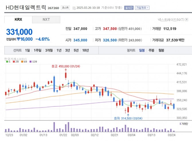 이미지 확대보기26일 한국거래소에 따르면 오전 9시20분 HD현대일렉트릭은 전날 대비 3.46% 내린 33만5000원에 거래되고 있다. 효성중공업은 1.64% 하락한 45만원에 거래 중이다. LS ELECTRIC은 0.31% 내린 19만600원을 기록하고 있다.