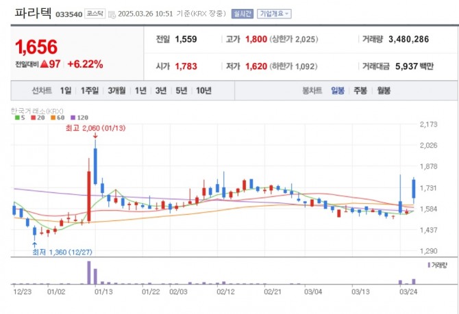이미지 확대보기26일 한국거래소에 따르면 오후 2시 49분 기준 코스닥시장에서 파라텍은 전 거래일보다 3.01% 오른 1606원에 거래 중이다. 이 회사는 스프링쿨러, 소화기, 화재감지기 등 각종 소방안전제품과 설비를 제조하는 기업이다. 파라텍 주식은 장 초반 15% 넘게 오르기도 했다.