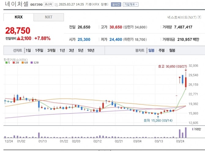 이미지 확대보기이날 한국거래소에 따르면 오후 2시 36분 네이처셀은 전 거래일 대비 7.69%(2050원) 오른 2만8700원에 거래되고 있다.