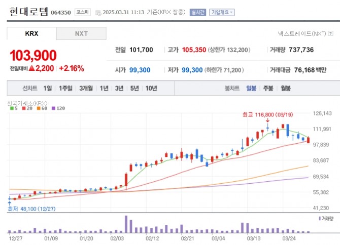 이미지 확대보기31일 한국거래소에 따르면 이날 오전 11시 13분 현대로템은 전 거래일 대비 2.16% 오른 10만 3900원에 거래되고 있다.