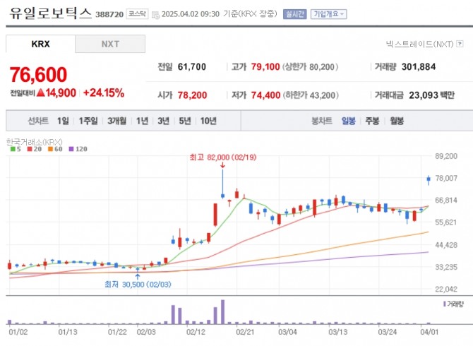 2일 한국거래소에 따르면 오전 9시 30분 유일로봇틱스는 전 거래일 대비 24.15% 오른 7만6600원에 거래되고 있다. 장중 한때 8만200원까지 올랐다.
