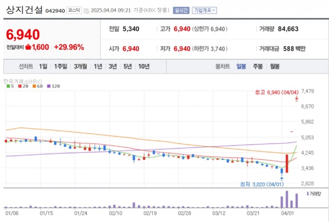 이미지 확대보기4일 한국거래소에 따르면 오전 9시21분 상지건설은 전날 대비 29.96% 오른 6940원에 상하가로 직행했다. 형지글로벌은 전날 대비 12.15% 오른 1만1630원에 거래 중이다.