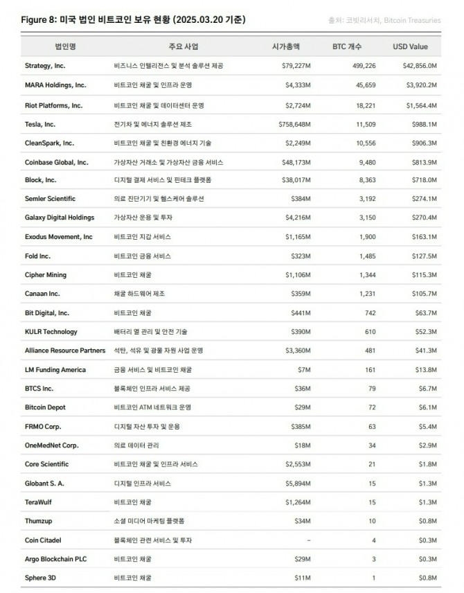 미국 상장법인들의 비트코인 보유 현황을 분석한 결과 비트코인을 보유한 기업들은 주로 가상자산 전문법인이며, 일반법인들도 자금 조달을 통해 비트코인 투자를 확대하고 있다. 갤럭시 디지털과 같은 가상자산 전문법인들은 사업 활동을 통해 획득한 비트코인을 보유하거나 유보 현금을 활용해 추가 매수를 진행해 왔다.