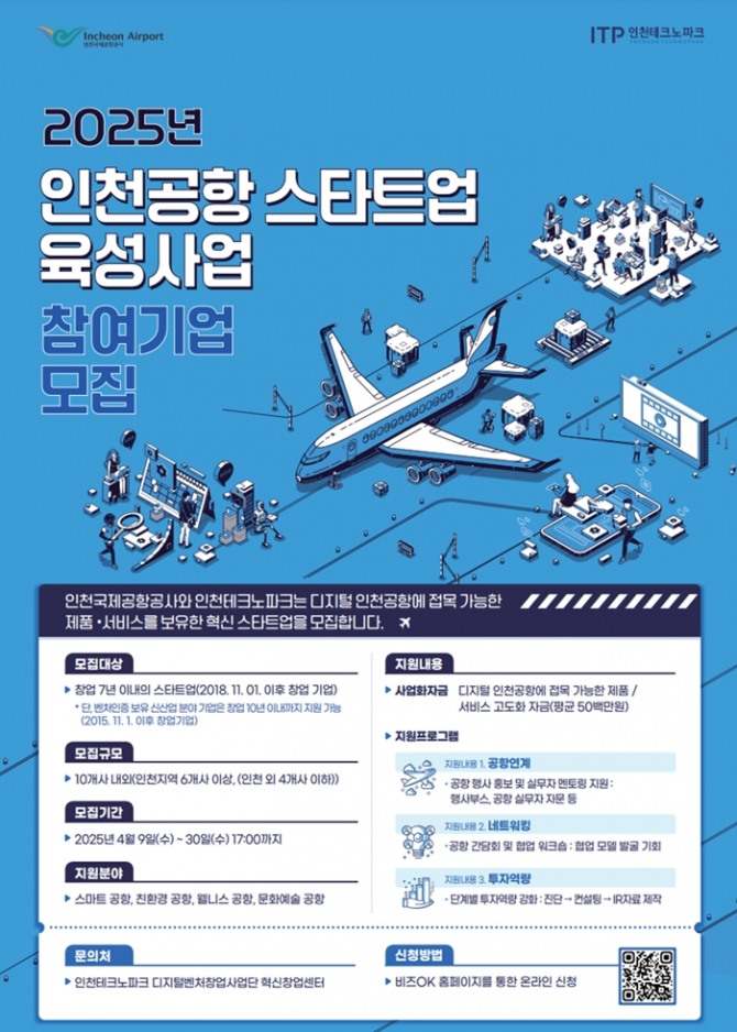 이미지 확대보기인천공항공사는 혁신 스타트업 발굴을 통한 공항산업의 차세대 성장동력 확보를 위해 오는 30일까지 ‘2025년 인천공항 스타트업 육성사업’의 참여기업을 모집한다고 9일 밝혔다.