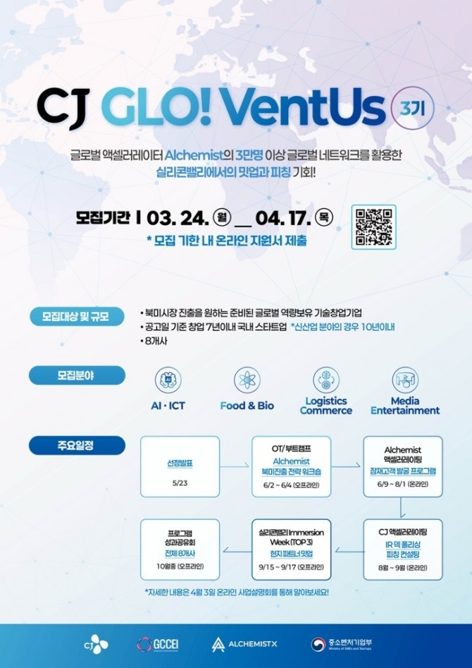 참가를 희망하는 스타트업은 오는 17일까지 국내 스타트업 이벤트 플랫폼인 이벤터스(2025 CJ GLO!VentUs 3기 글로벌 오픈이노베이션 프로그램 - 이벤터스)에서 접수할 수 있으며 서류 및 인터뷰 심사를 거쳐 오는 5월 23일 총 8개팀이 선정된다. 이들 가운데 선발된 우수성과 TOP3팀에 대해서는 SV이머전 위크 참여 지원금을 지급할 계획이다.