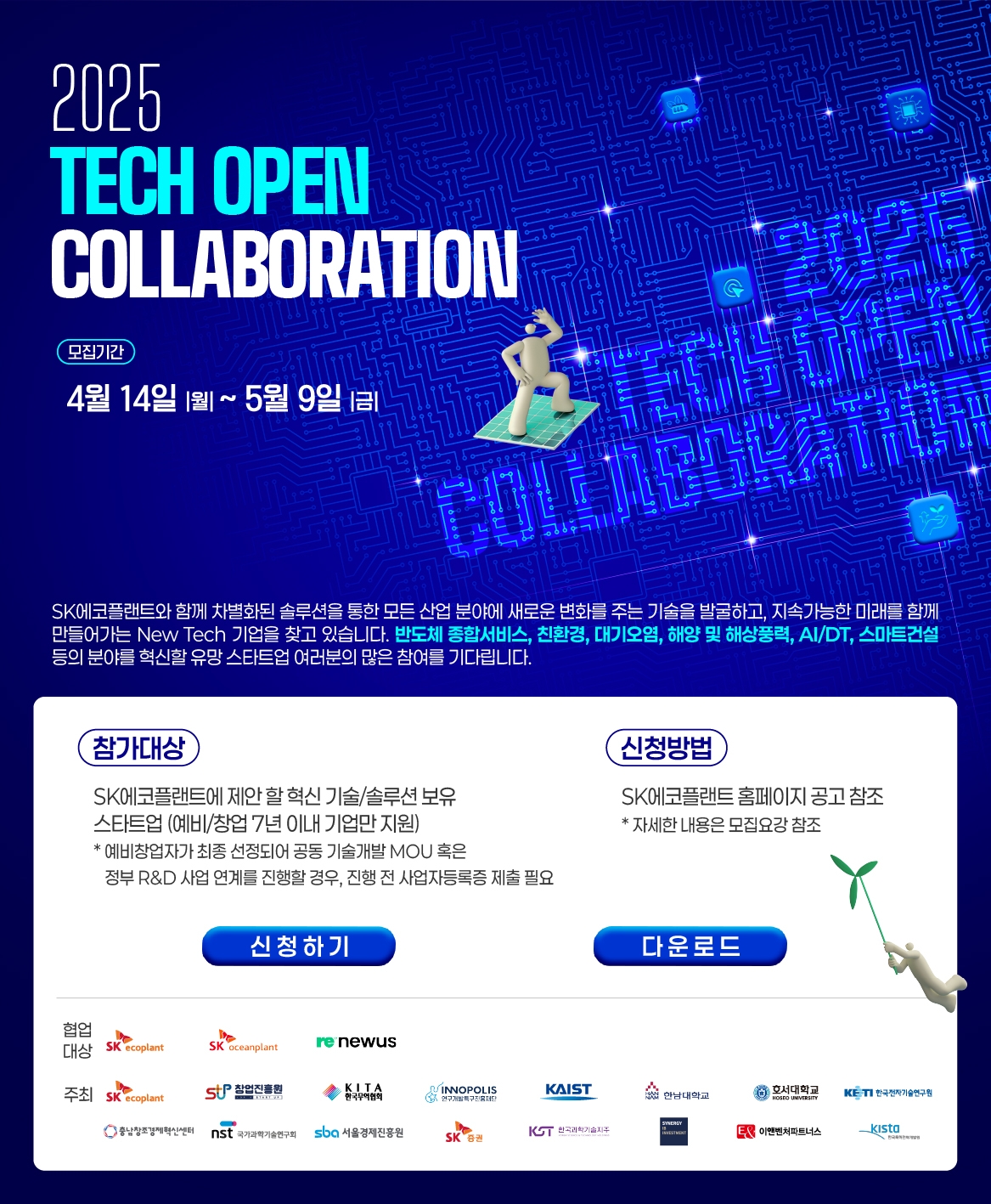 이미지 확대보기14일 건설업계에 따르면 SK에코플랜트가 이날부터 다음달 9일까지 반도체·AI(인공지능) 분야 스타트업 발굴 및 육성을 위한 ‘테크 오픈 콜라보레이션(Tech Open Collaboration)’ 공모전을 개최한다.