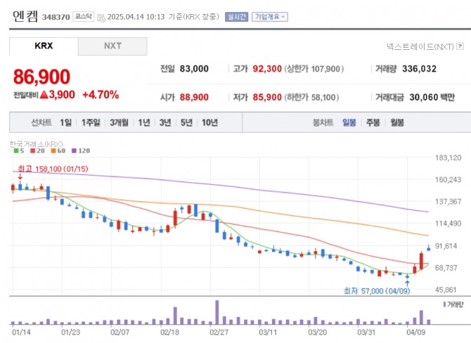 14일 한국거래에 따르면 오전 10시 13분 엔켐은 전 거래일보다 4.70% 오른 8만6900원에 거래되고 있다.