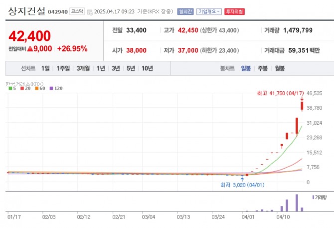 이미지 확대보기17일 한국거래소에 따르면 이날 오전 9시 23분 현재 상진건설은 전 거래일 대비 26.95% 오른 4만원에 거래되고 있다. 주가는 지난 15일 하루 거래 정지 뒤 전날 상한가까지 오른 뒤 이날 다시 또다시 급등하고 있다. 이달 1일만해도 3165원이었던 주가(종가 기준)는 4만원대로 치솟았다.