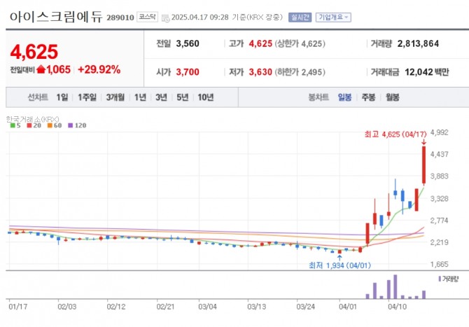 이미지 확대보기17일 한국거래소에 따르면 오전 9시28분 아이스크림에듀는 전일 대비 29.92% 오른 4625원에 거래 중이다. 한덕수 대통령 권한대행 국무총리의 대선 출마 여부가 결정되지 않은 상황 속 투자자들의 기대가 쏠린 것으로 풀이된다.