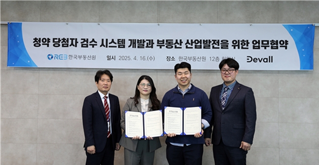 한국부동산원은 지난 16일 한국부동산원 본사에서 데브올컴퍼니와 '청약 당첨자 검수 시스템 개발과 부동산 산업 발전을 위한 업무협약'을 체결했다.