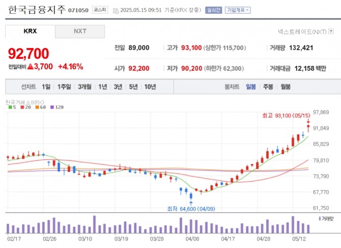이미지 확대보기15일 한국거래소에 따르면 오전 9시 51분 현재 한국금융지주는 전 거래일보다 4.16% 오른 9만 2700원에 거래되고 있다. 장중 9만 3100원까지 치솟아 52주 신고가를 경신했다.