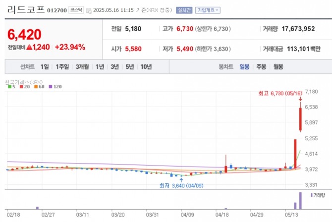 이미지 확대보기16일 한국거래소에 따르면 이날 리드코프의 주가는 전일 대비 11.20% 상승한 5750원에 거래를 마감했다. 장중 한때 6730원까지 오르면 신고가를 터치했다.