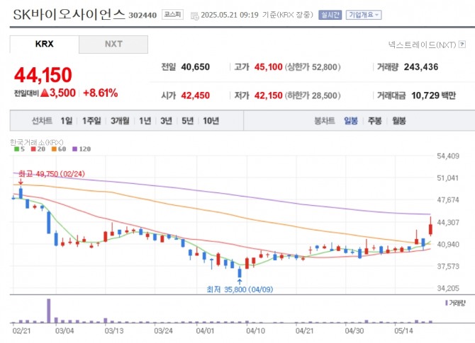 이미지 확대보기21일 한국거래소에 따르면 이날 오전 9시19분 현재 SK바이오사이언스는 전거래일 대비 8.61% 오른 4만 4150원에 거래 중이다.