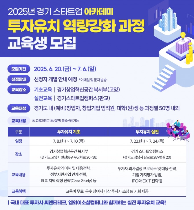 기초 과정은 오는 7월 8일부터 10일까지 고양시 경기창업혁신공간 북서부권에서 진행된다. 교육 내용은 △스타트업 투자 개요 △VC 투자유치 전략 △정부사업과 민간투자의 연계 방안 △IR 및 사업계획서 작성 등 창업 초기 기업에 필수적인 내용을 중심으로 구성됐다.
