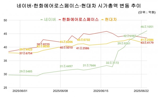 이미지 확대보기23일 네이버는 전 거래일 대비 7.61(2만500원) 오른 29만원에 거래를 마감했다. 장중 29만5000원까지 오르며 52주 신고가를 다시 썼다. 이날 종가 기준 시가총액은 46조1051억 원으로 한화에어로스페이스와 현대차를 제치고 시총 5위에 올라섰다. 이달 들어서만 네이버의 주가는 54.66%(10만2500원) 올랐다.