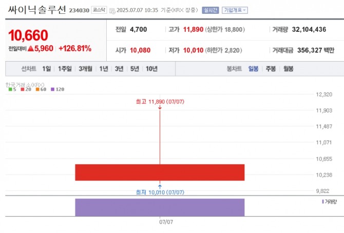 이미지 확대보기이날 한국거래소에 따르면 오전 10시 35분 기준 싸이닉솔루션은 공모가(4700원)보다 126.81% 오른 1만660원에 거래 중이다.