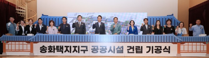 평택시가 송화택지지구 공공시설 건립 기공식을 개최한 후 기념촬영을 하고 있다. 사진=평택시이미지 확대보기