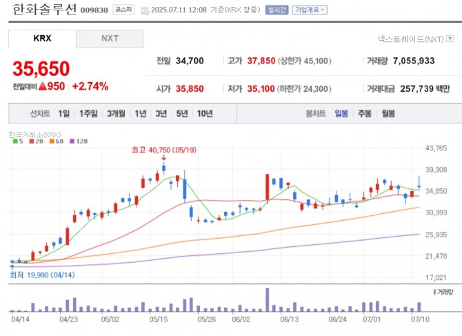 이미지 확대보기11일 한국거래소에 따르면 이날 오후 12시 08분 한화솔루션은 전장대비 2.74% 오른 3만5650원에 거래중이다. OCI홀딩스는 11.19% 오른 9만 3400원, 대명에너지 7.66%, 파루 4.85%, HD현대에너지솔루션 3.68% 등도 상승 중이다.