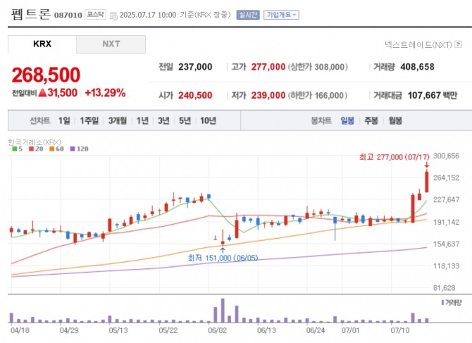 이미지 확대보기17일 한국거래소에 따르면, 펩트론은 오전 10시 00분 기준 전 거래일 대비 13.29% 오른 26만 8500원에 거래되고 있다. 이날 27만7000원까지 상승하며 52주 '신고가'를 경신했다.