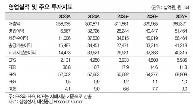 삼성전자의 2025년 실적 전망치는 매출 311조5610억원, 영업이익 28조2440억원이며, 2026년에는 매출 329조9650억원, 영업이익 40조4470억원으로 큰 폭의 실적 개선이 기대되는 상황이다.