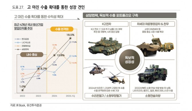 특히, 2022년 6.3%에 불과하던 수출 비중은 2023년 40%, 2024년 41%까지 확대됐으며, 올해 1분기에는 수출 비중이 내수 비중을 뛰어 넘어 향후 K방산의 해외진출 가속화에 따른 직접적 수혜가 지속될 것으로 기대된다. 삼양컴텍은 기존 고객사와의 파트너십을 강화하며 함께 성장 중이며, 신규 솔루션을 개발하며 성장 동력을 확보해 나가고 있다.