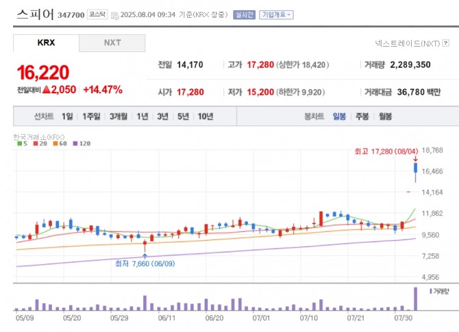 이미지 확대보기4일 한국거래소에 따르면 스피어는 오전 9시 34분 기준으로 전 거래일 대비 14.47% 오른 1만 6220원에 거래되고 있다.