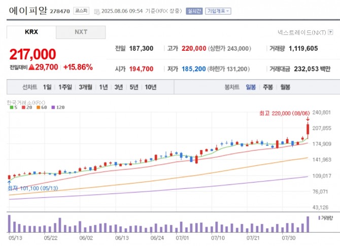 이미지 확대보기6일 한국거래소에 오전 9시54분 기준 에이피알은 전날 대비 15.86% 오른 21만1700원에 거래되는 중이다. 장 초반 22만원까지 치솟으며 52주 최고가를 다시 썼다.