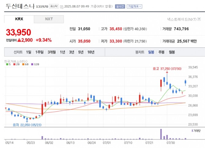 이미지 확대보기7일 한국거래소에 따르면 이날 오전 9시 49분 기준 두산테스나는 전 거래일 대비 9.34% 오른 3만 3950원에 거래되고 있다. 솔브레인은 같은 시각 5.22%, 원익IPS 1.48% 등이 오르고 있다.
