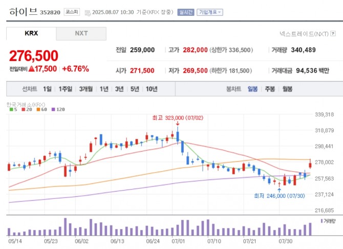7일 한국거래소에 따르면 이날 오전 10시 30분 기준 하이브의 주가는 전 거래일 대비 6.76% 상승한 27만6500에 거래되고 있다.