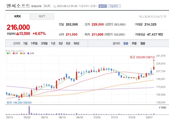 이미지 확대보기12일 한국거래소에 따르면,이날 오전 9시 28분 현재 엔씨소프트는 전 거래일보다 6.67% 오른 21만 6000원에 거래되고 있다.