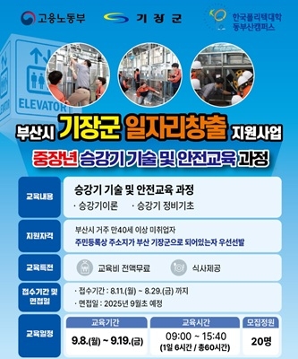 군은 ‘기장군 일자리창출 지원사업’의 일환으로 한국폴리텍대학 동부산캠퍼스와 협력해 ‘중장년 승강기 기술 및 안전교육’ 프로그램을 개설하고, 오는 29일까지 교육생을 모집한다.