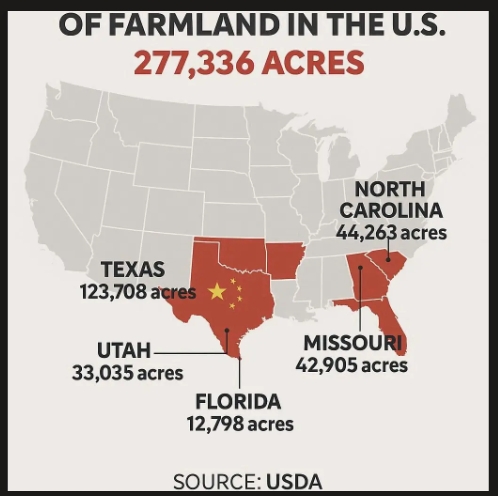 미국 농무부(USDA) 보고서에 따르면 중국 기업이 보유한 미국 농지는 텍사스 12만3708에이커, 노스캐롤라이나 4만4263에이커, 미주리 4만2905에이커, 유타 3만3035에이커, 플로리다 1만2798에이커 등 5개 주에 전체의 93%가 몰려 있다. 농경지 규모에는 산림과 일반 농지가 포함되며, 농업용이 아닌 토지는 집계되지 않는다.