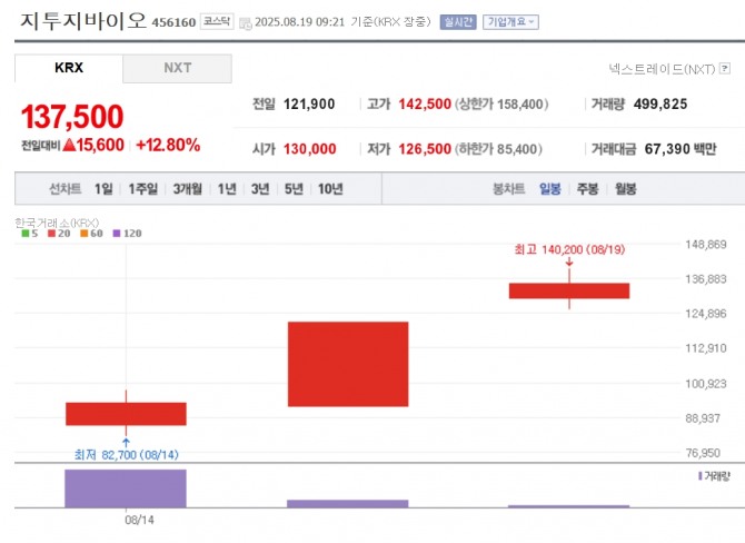 이미지 확대보기19일 한국거래소에 따르면 오전 9시21분 지투지바이오는 전일 대비 12.08% 오른 13만7500원에 거래되고 있다.