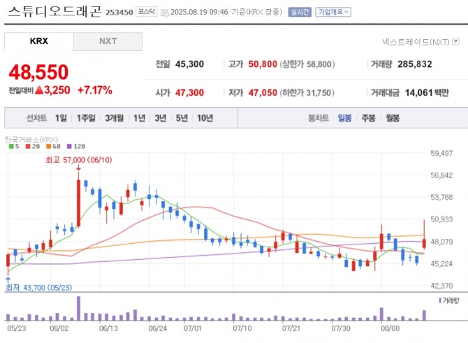 이미지 확대보기19일 한국거래소에 따르면 이날 오전 9시 46분 현재 스튜디오드래곤은 전 거래일 대비 7.17% 오른 4만8550원에 거래 중이다.