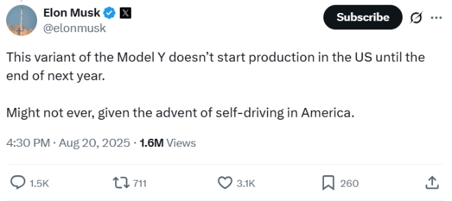 21일(이하 현지시각) 일렉트렉에 따르면 머스크 CEO는 전날 X에 올린 글에서 “모델Y L은 미국에서 내년 말까지 생산을 시작하지 않으며 자율주행이 미국에서 본격화되면 아예 없을 수도 있다”고 밝혔다.